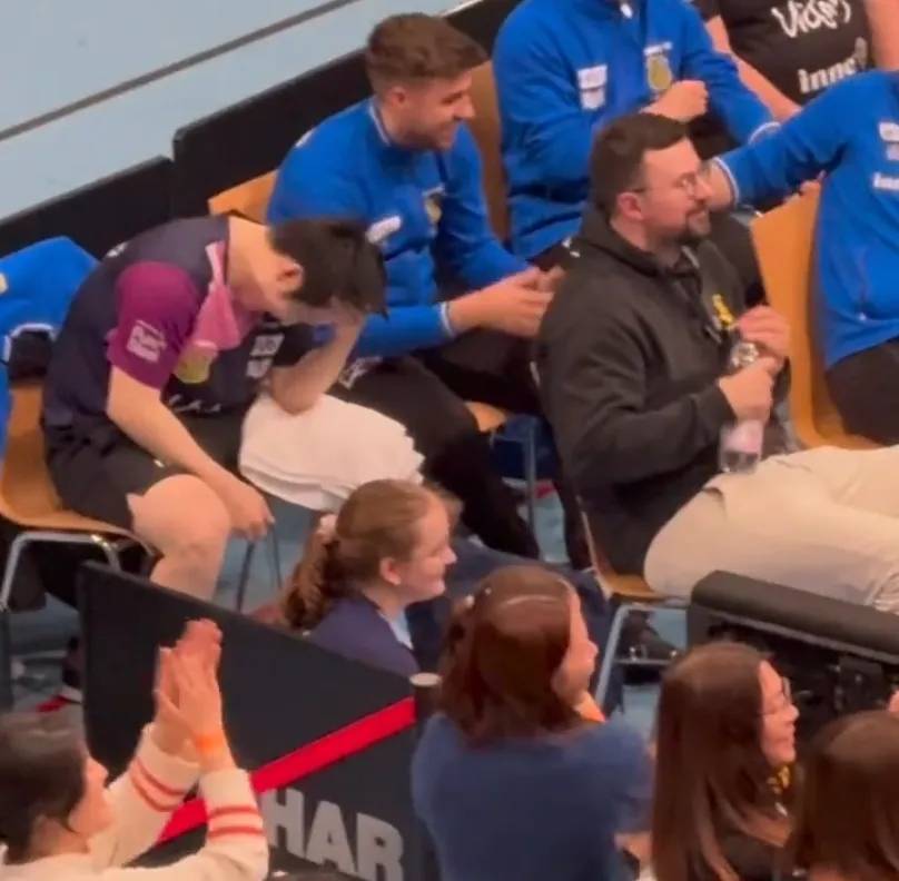 而替补席上的樊振东,看到这一幕后,直接笑疯了,笑得人仰马翻,丝毫没有因为两场被逆转、遭遇两连败而郁闷。现场的球迷们,一边看着小莫模仿,一边为他鼓掌欢呼,整个赛场都被这种欢乐的氛围包围,格外温馨。
